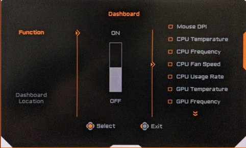 只要选择OSD菜单上的快捷键就可以使用AORUS仪表盘功能,AORUS仪表盘可以实时显示关键硬件信息,如CPU电压、时钟速度、温度、使用情况、风扇转速等其他游戏辅助功能。