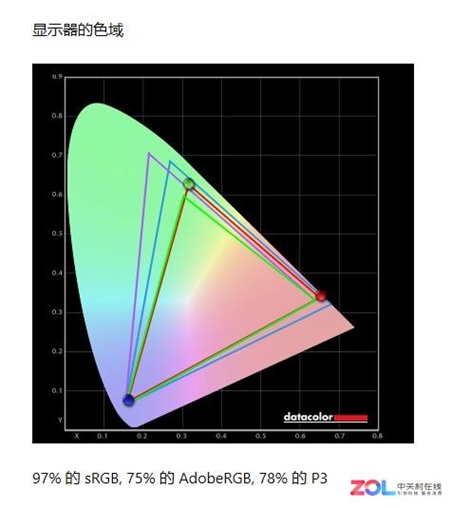 在色域覆盖度的测试上,技嘉 KD25F电竞显示器对sRGB色域的覆盖度为97%,AdobeRGB色域的覆盖度为75%,78%的P3色域,对于一款专业电竞显示器来说,这个表现还是不错的。