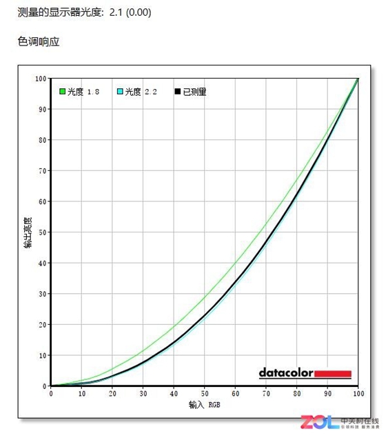 色调响应方面,已测量的黑色曲线应该尽量和浅蓝色的光度2.2曲线保持一致,可以看到实测的黑色曲线和光度2.2曲线非常接近,色调响应表现不错。