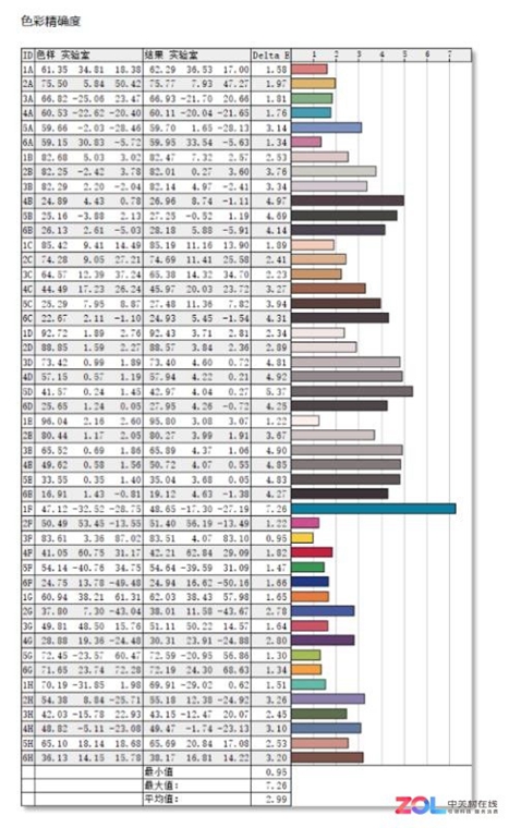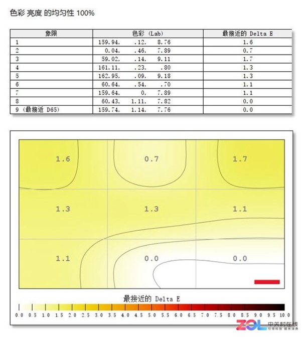 在色彩均匀性的测试中,可以看出显示器左左下角两块区域都很接近D65的标准,显示器右上角的色温与标准色温值有一定差距,差距数值为1.7,显示器整体的色彩均匀性表现非常不错,个人来讲十分满意。