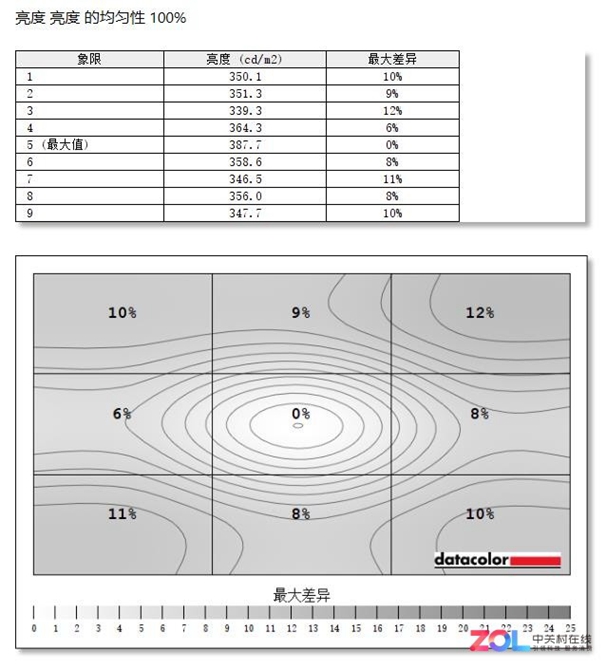 亮度均匀性测试中,技嘉 KD25F电竞显示器最亮的地方在显示器中间区域,为387.7cd/㎡,亮度差异最大的也是在右上角,差异为12%。