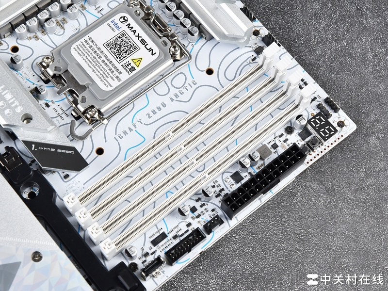 顶部区域铭瑄瑄 Z890 Arctic主板支持DIY快捷开启和重启,同时配备检测故障很好用的Debug数字检测屏。