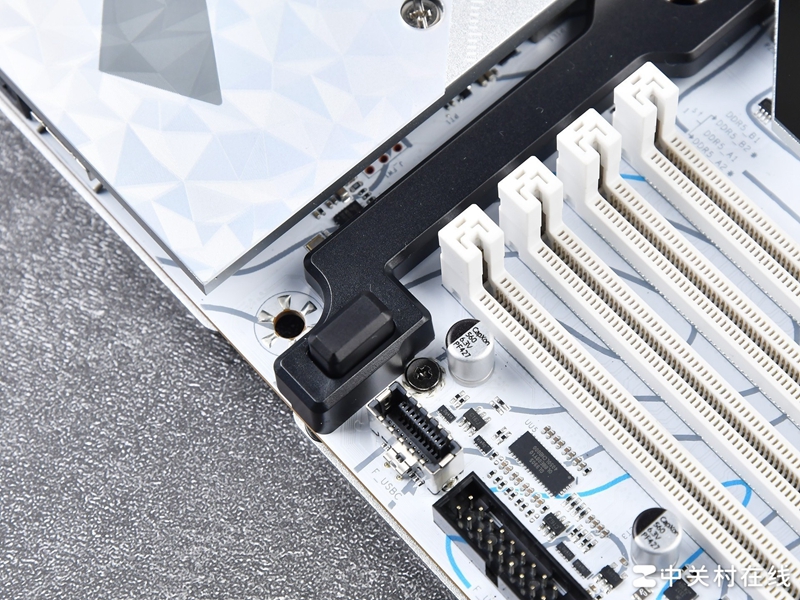 拓展上先来看看PCIe插槽,铭瑄瑄 Z890 Arctic主板总共配备4根PCIe全尺寸插槽,这在顶级主板中也比较少见,其中A和C槽分别为PCIe5.0x16(可拆分)。可拆分成PCIe 5.0x8或者PCIe 5.0x4+x4(需拆分,不然是空槽),B和D槽则是PCIe 4.0 x4。