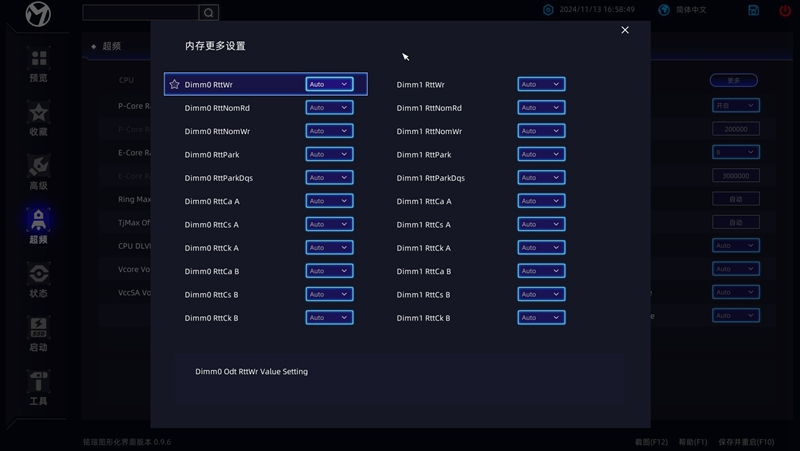 接着来到OC超频界面,铭瑄将CPU、内存以及电压三个重要设置整合在这个界面中,当然可以通过子项中的更多选项调节一些细节设置。