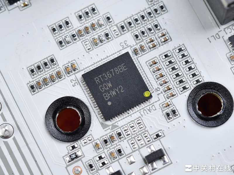 下面来看一下这款主板的供电模组,技嘉 B650E 冰雕背插版主板用料给的很足,这次提供12+2+2相供电设计,PWM控制器型号为RT3678BE,核心12相供电采用Dr.Mos设计,型号为NCP302155,支持60A电流,这套供电模组应对目前主流的锐龙7000/锐龙9000处理器是完全没有问题的,加上这两代锐龙也没什么超频空间,甚至PBO都不太用开,默频使用即可发挥出大部分性能表现。