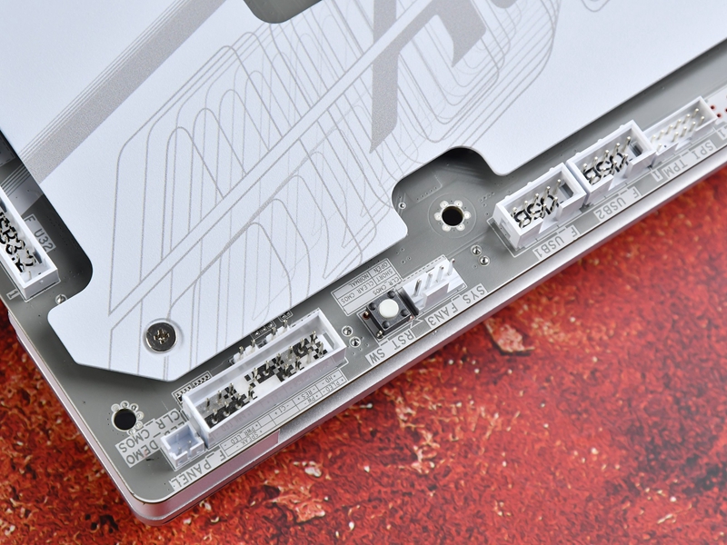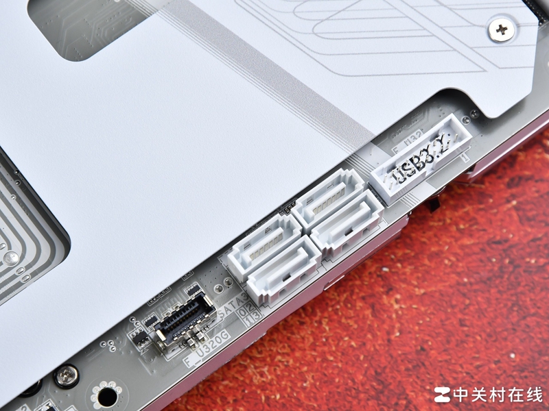 SATA接口也放在了背面,总共有4个,并且周围提供一个USB 3.2 Gen 2x2 Type-C(20Gbps)接针和一个USB 3.2 Gen 1 Type-A(5Gbps)接针。