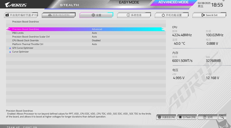再往下一页来到了设置界面,主要调节I/O相关设置,还有可以在这里进行PBO深度调节,前面的PBO是技嘉的一键PBO调优,这里则可手动调整,适合深度玩家。