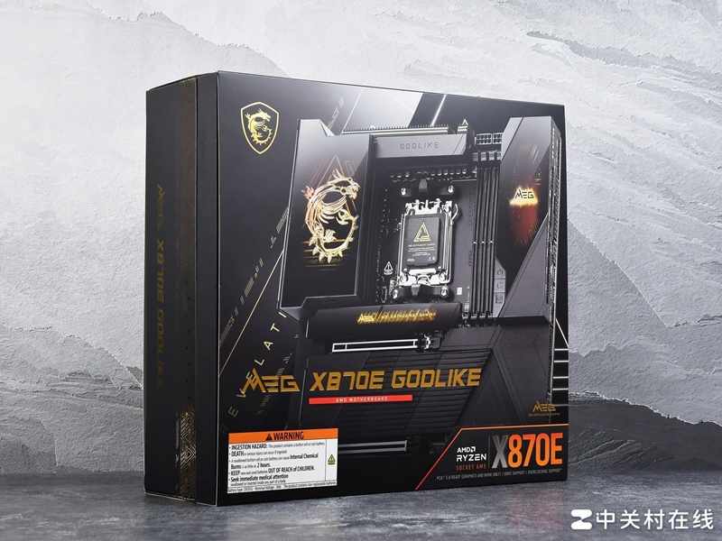微星 X870E GODLIKE超神主板外包装尽显尊贵气息,这几代的超神主要以黑色为主,辅以霸气侧漏的金色龙纹LOGO装饰。