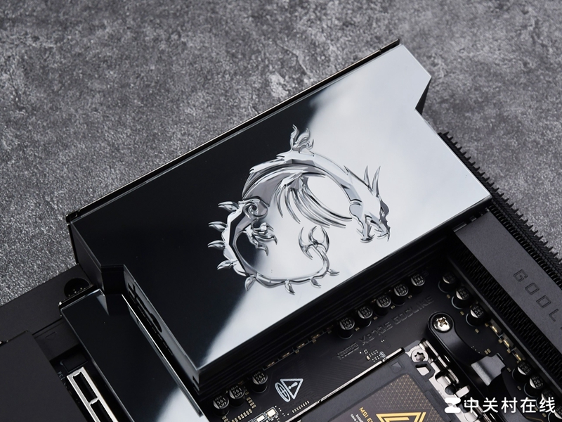 这款主板VRM散热装甲采用了铝合金材质的镜面设计,不过这个龙纹LOGO本身没有光效,底部的镜面装甲支持RGB光效,亮度恰到好处,透出的光线足以照亮整个LOGO,又不会产生光污染。