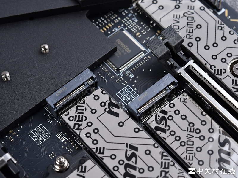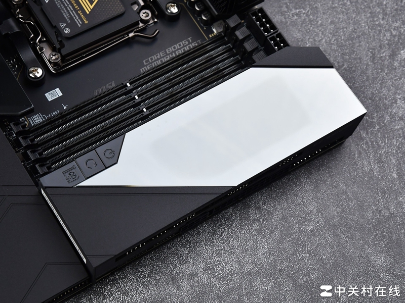 这款主板采用了全覆盖式装甲设计,而且考虑到装机后的效果,微星特意采用了隐藏式侧插接针,正面除了CPU供电接口和内存、PCIe插槽外见不到其他主板接针,设计效果接近了背插主板,正面几乎无线材裸露,这种纯正简约风格符合时下装机潮流,难得能在超神这种旗舰主板中见到这样影响整个装机风格的外观创新设计。