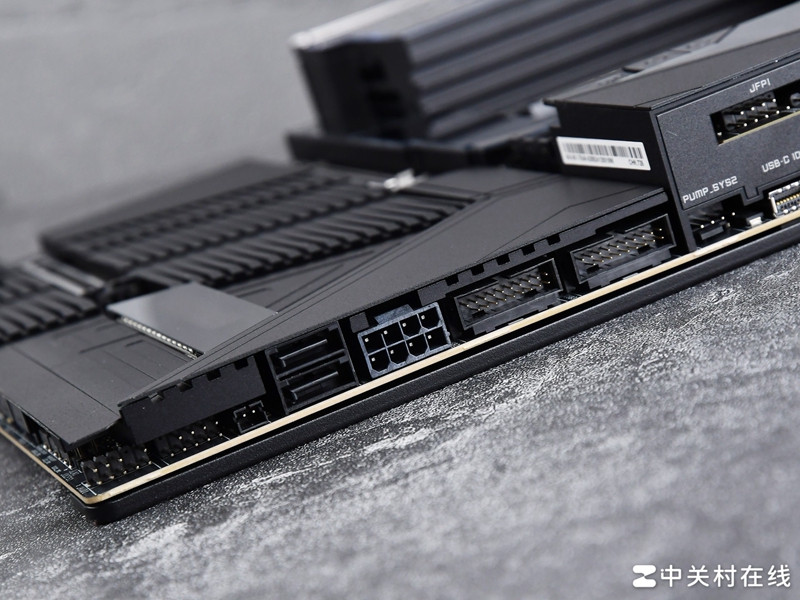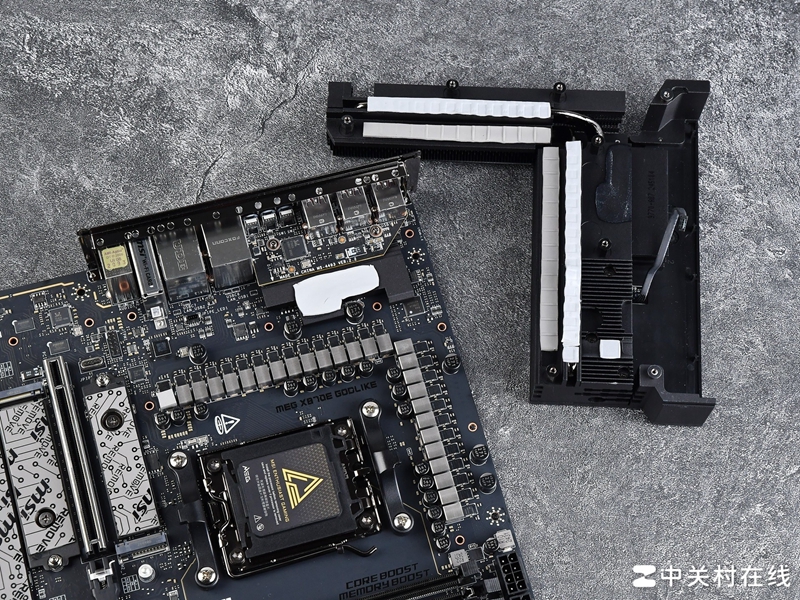 这款主板的VRM散热装甲规模也前所未有的庞大,采用了波浪式鳍片设计,两块鳍片之间连接直触式交叉导热管,并且为MOS管准备了9W/mK散热垫。