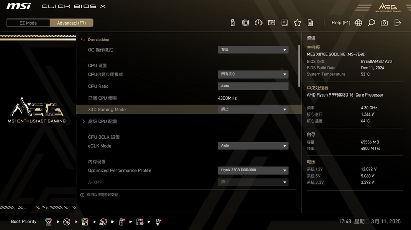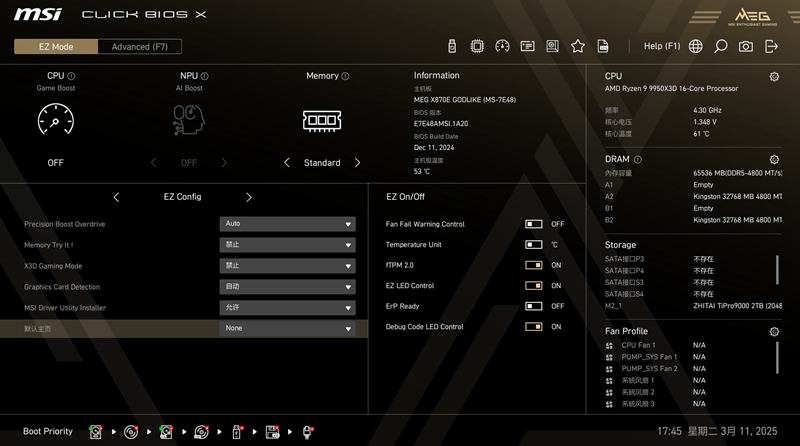 下面来看一下微星 X870E GODLIKE超神主板的BIOS设计,首先进入集成了重要信息参数的EZ-MODE主菜单,可以快速调节PBO、Memory Try lt、X3D游戏模式等功能。