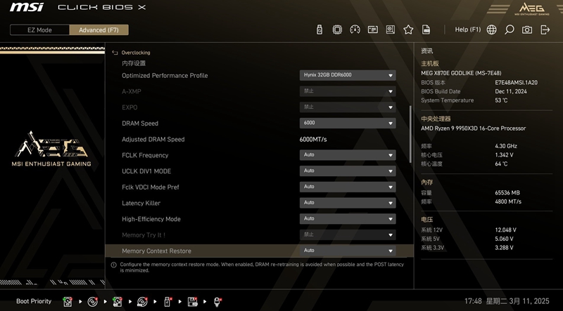 细节方面,微星 X870E GODLIKE超神主板供电应对AMD 锐龙9 9950X3D甚至让笔者有一种大材小用的感觉,24+2+1相供电模组足够提供更多超频可能性。同时微星BIOS功能越来越丰富人性化,DDR5超频也提供了真香优化,省去玩家手动调节小参时间。