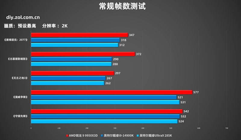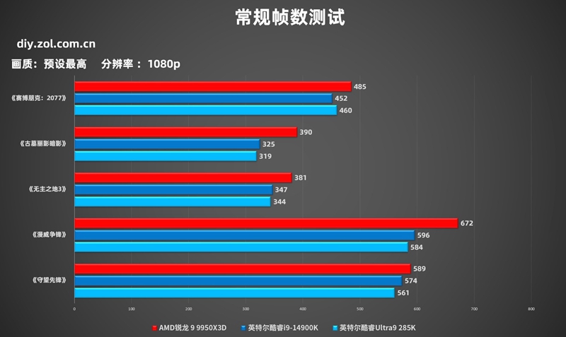 我们这次测试了《守望先锋》《漫威争锋》《无主之地3》《古墓丽影暗影》《赛博朋克:2077》这几款游戏,分辨率为最吃CPU的2K、1080p,游戏画质预设最高,会开启50系显卡的多帧生成,在对比隔壁14代酷睿平台以及酷睿Ultra平台时因为众所周知的原因会在其主板BIOS中调整成英特尔默认设置进行跑分对比,避免出现稳定性波动。下面首先看一下1080p分辨率的帧数。
