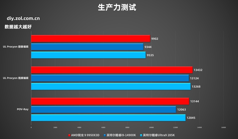 我们下面还测试了AMD 锐龙9 9950X3D生产力表现,我们使用POV-Ray多核渲染和UL Procyon 图像、视频编辑进行测试。POV-Ray属于生产力基准测试,而UL Procyon图像/视频测试则会调用Adobe Photoshop、Lightroom Classic、Adobe Premiere Pro这些常用剪辑作图软件进行模拟操作实测。