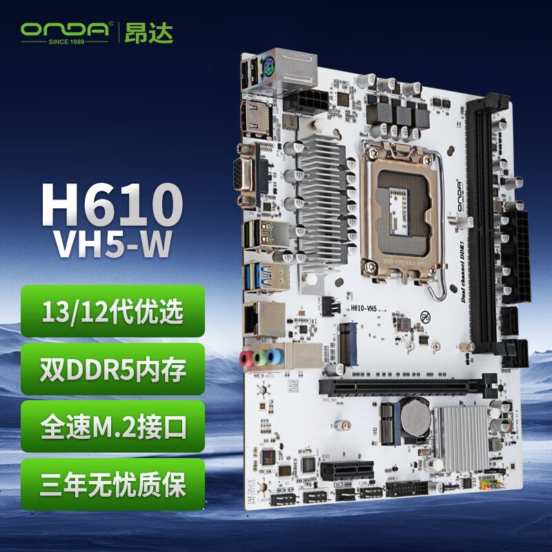 昂达 H610-VH5-W主板(Intel H610/LGA 1700),是一款支持DDR5、Intel 12代CPU(如G7400、12100、12100F等)的主板,非常适合娱乐办公使用。