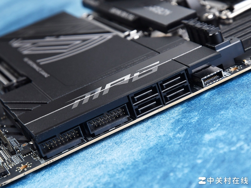 侧插式SATA接口这款主板目前有4个,旁边是两个前置5Gbps速率USB 3.2 Gen 1 Type-A接针,和一个20Gbps速率的USB 3.2 Gen 2x2 Type-C接针。