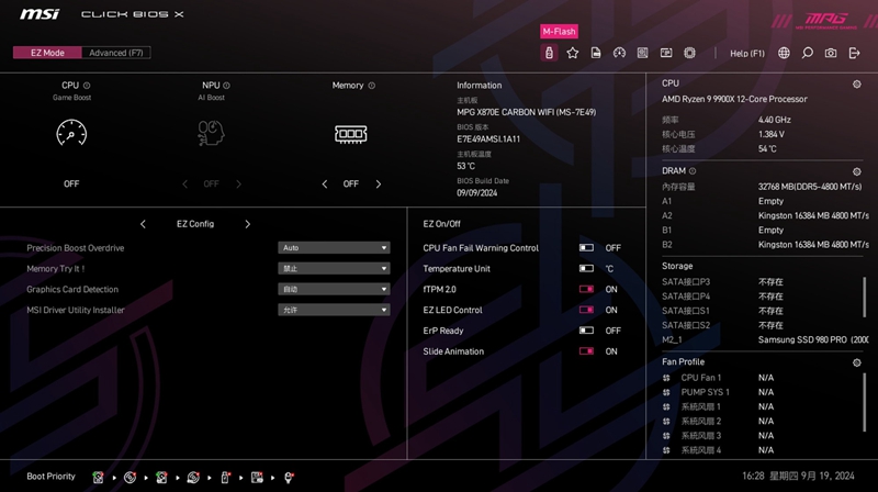 微星目前对这款暗黑主板BIOS风格进行了精简,EZ Mode主菜单增加了更多重要参数设置,如CPU、内存、NPU、PBO这些设置一键超频开关,还能在右侧直接看到核心参数。