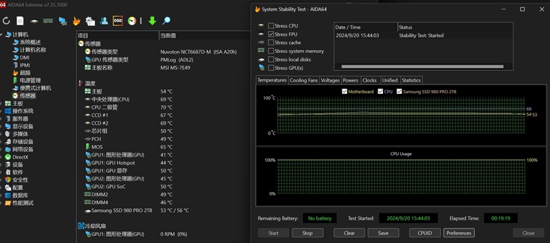 我们还针对微星 X870E 暗黑主板的稳定性进行拷机测试, 使用了AIDA 64进行压力最大的FPU拷机,散热器为360MM水冷。