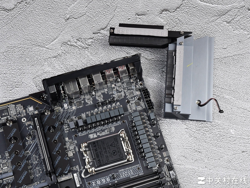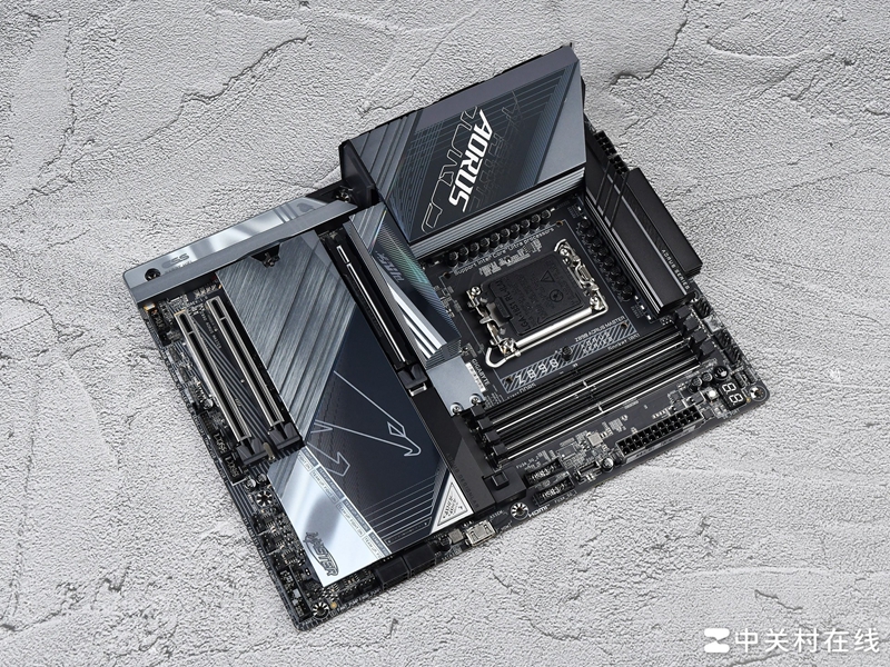 技嘉 Z890超级雕主板板载5组M.2插槽,两组使用双向散热垫的插槽支持PCIe 5.0,剩下三组使用了PCIe 4.0。