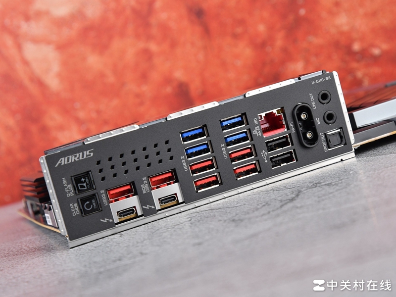 I/O区域这款主板提供了高达14组USB接口,包含2个黑色USB 2.0接口,4个蓝色USB 3.2 Gen1接口,6个红色USB 3.2 Gen 2 Type-A,以及2个雷电4接口,扩展能力十分惊人。此外I/O区域还配备Clear CMOS,Q-FLASH PULS这两个功能按键,以及1个10G有线网口和采用了全新插拔方式的Wi-Fi7天线接口。