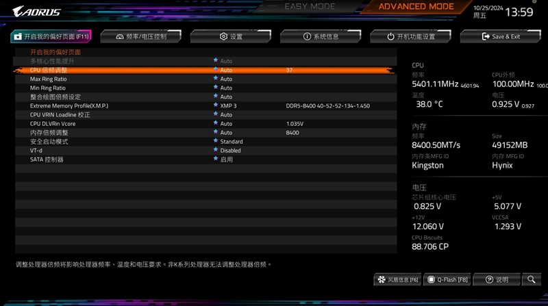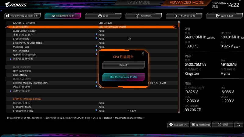 旁边是最重要的OC超频菜单,技嘉主板重要的超频参数都在这里设置,支持CPU性能提升这项一键提升酷睿Ultra 200S性能的功能,高端散热用户可以酌情开启。