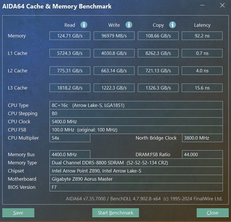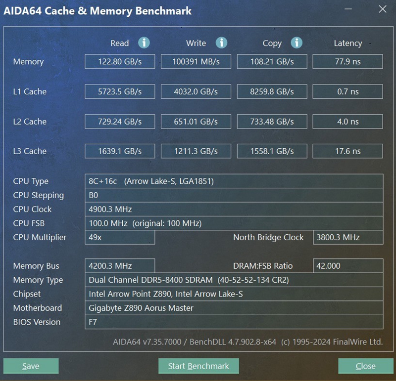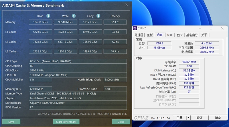 酷睿Ultra 200S一大特点是频率显著提升,所以我们首先测试了一下技嘉 Z890超级雕主板平台内存上面的表现。我们首先直接开启手里这组内存的XMP 8400。