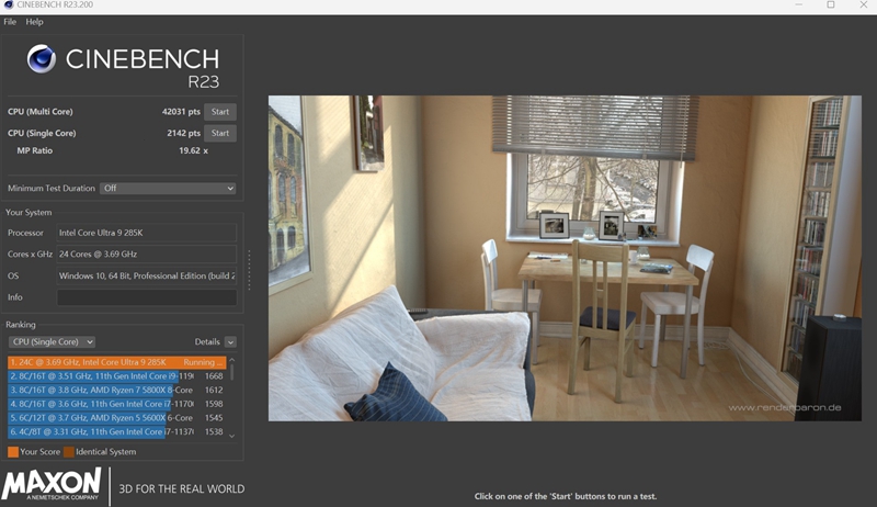接下来咱们使用技嘉 Z890超级雕主板对Ultra9 285K进行基准跑分测试,我们使用了大家常用的CINEBENCH R23进行测试,主要针对CPU多核以及单核性能上进行跑分。