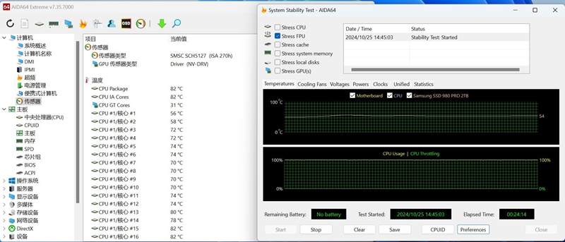 酷睿Ultra 200S这代最重要的就是能耗比的显著优化,最后我们来测试一下Ultra 9 285K的拷机功耗,使用AIDI 64进行FPU单拷,散热器为360MM水冷。