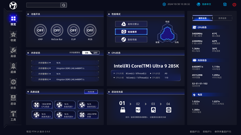 预览界面提供了XMP,ReSizeBar,EUP和RGB的开关,内存状态监控,风扇设置,性能模式,CPU状态,以及启动优先级几个常用功能,右侧是硬件状态和基本信息。