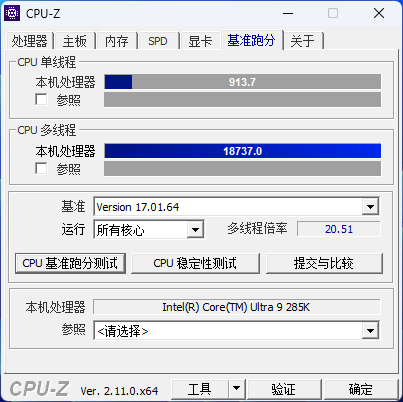 在多线程测试中,Ultra 9 285K同样获得了出色的表现,CPU-Z得分18737分,CineBench R23斩获43501分,各项测试均优于酷睿i9-14900K和锐龙9 9950X,可见铭瑄 Z890-A WiFi对CPU性能的释放还是非常到位的。