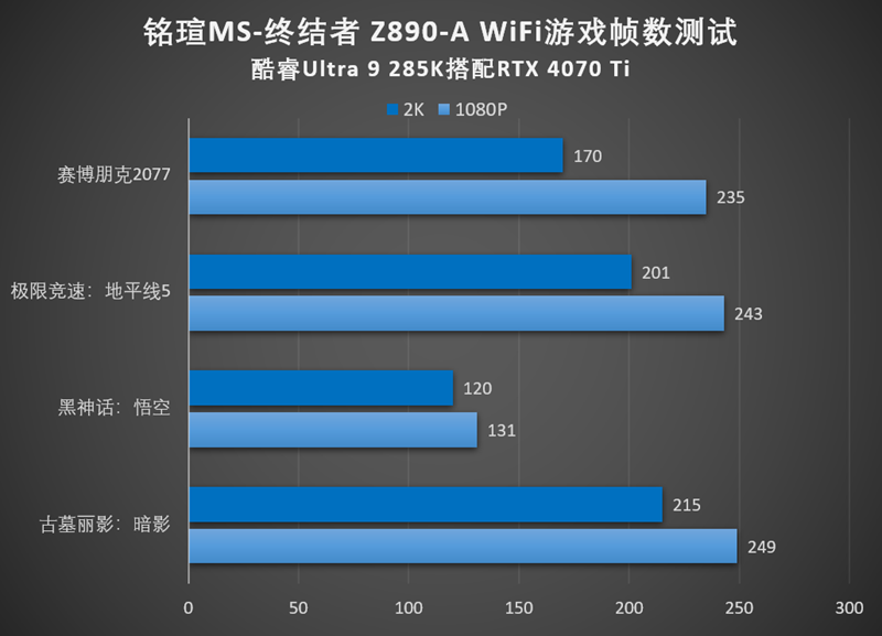 从游戏测试结果来看,酷睿Ultra 9 285K在铭瑄 Z890-A WiFi上的性能发挥稳定,搭配RTX 4070Ti让大多数3A大作在1080P的分辨率下都能拿到230帧的表现,2K分辨率也能稳定在170帧以上,只有《黑神话:悟空》因为对硬件要求更高,但也稳定在了120帧,有非常丝滑的表现。