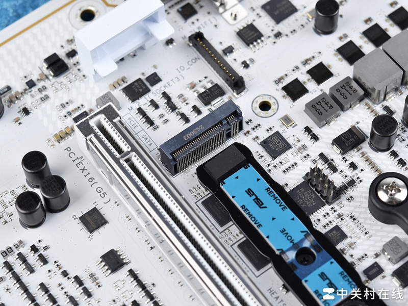 M.2上,华硕ROG X870吹雪S主板总共配备4组M.2插槽,两组支持PCIe 5.0,另外两组支持PCIe 4.0,都装备了金属散热装甲,以及免螺丝安装卡扣。