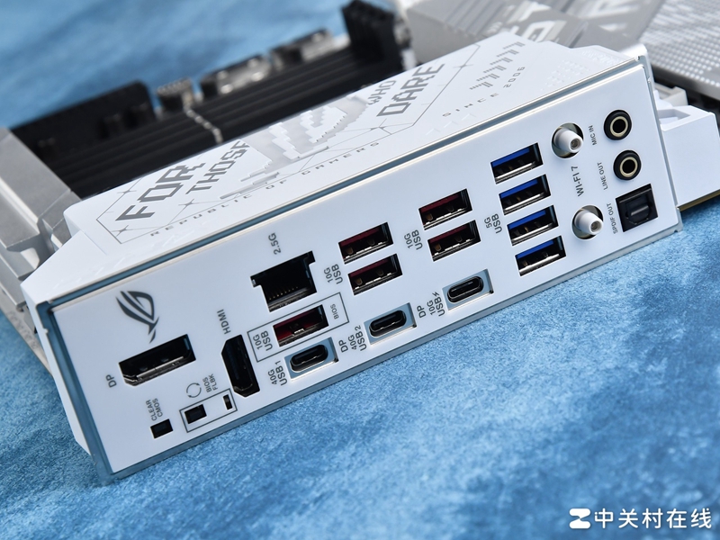 I/O区域,华硕ROG X870吹雪S主板的接口十分丰富,这款主板配备了12个USB接口在后置区域,包含4组USB 3.2 Gen1 Type-A接口,5组USB 3.2 Gen2 Type-A接口,一组USB 3.2 Gen2 Type-C接口,注意这个C口支持PD 30W快充,此外还有两个个重量级USB4接口,支持DP Alt 模式。其余接口包含一个DP接口一个HDMI接口,一个2.5H有线网口和WIFI7网卡天线接口。