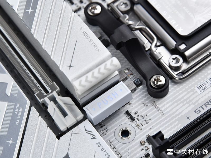 PCIe插槽上,华硕ROG X870吹雪S主板配备一根PCIe 5.0 x 16长插槽,一根PCIe 4.0 x 8插槽以及一根PCIe 4.0 x 4插槽。这根PCIe 5.0 x 16长插槽不仅满带宽,而且全新升级华硕显卡易拆装设计,这项设计此前曾出现在华硕的服务器和ROGBTF主板上,抓住显卡后,倾斜一下即可将显卡拔出,当然对于不熟练的用户,华硕保留了原始卡扣,觉得不放心的话可以用老方法拆卸。