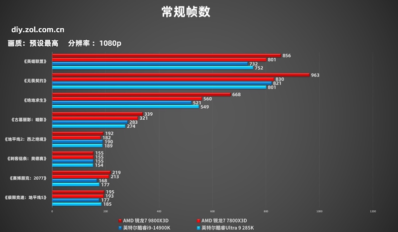 在1080p的帧数测试中,AMD 锐龙7 9800X3D占据了明显的领先优势,在我们测试的这8款游戏测试中,不管是网游还是单机,都有更强的帧数表现,甚至一些网游测试中出现了大幅领先的情况,领先帧数高达百帧以上。