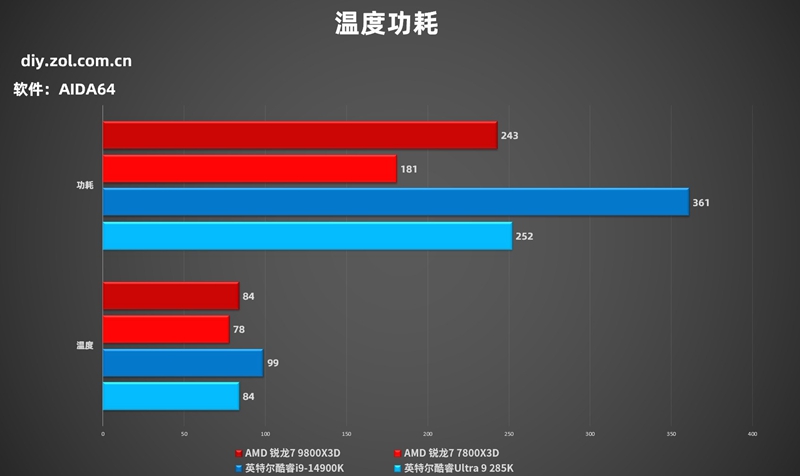 相较于上代,AMD 锐龙7 9800X3D在功耗和温度上出现了上涨,没有实现锐龙7 9700X那样的完美功耗控制有点可惜,不过考虑到这款处理器游戏上的性能增幅,倒也能接受,而且温度和功耗都在可控范围内,对比隔壁旗舰型号还是有优势的。