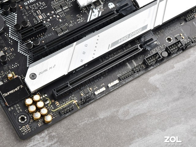 总共有4个M.2插槽,都支持PCIe4.0,并使用散热装甲。顶部的M.2插槽直接连接到CPU,有自己的散热背板,理论性能会更好。