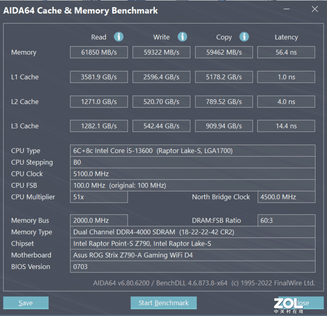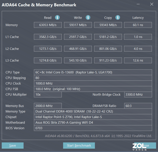 最后,我们使用AIDA64进行复制测试,看看酷睿i5-13600K的温度性能。