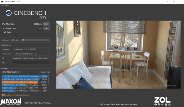CPU我们用CINENCHR23进行测试,这个软件可以测试处理器的基准性能。