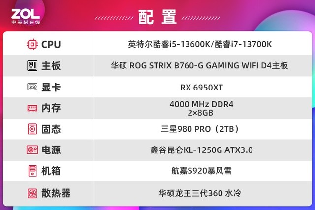 本次测试主要通过酷睿i5-13600K和酷睿i7-13700K两个处理器进行压力测试。所以我们用华硕RYUOII360ARGB散热器做散热器,龙王3代提供三个ROGAF12SARGB风扇,冷头也是全新的设计,充满科技感。