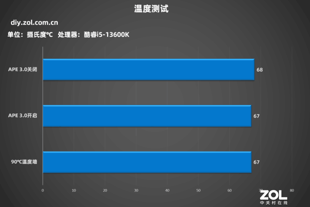 经过测试,发现APE3.0和90℃温度墙后复制器在使用酷睿i5-13600K时,温度从68℃下降到67℃,只有1℃的差距,温度变化不大。