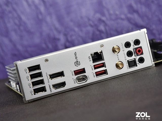 I/O区域,该主板预装了I/O挡板,提供4个USB2.0接口,3个USB3.2Gen2Type-A接口,一个USB3.2Gen2x2Type-C接口,速度高达20Gbps。与此同时,还有HDMI和DP视频接口,专门为12/13代酷睿准备。最终,该主板还有一个2.5G有线网口,一个Wi-Fi6E天线接口和五个音频接口。