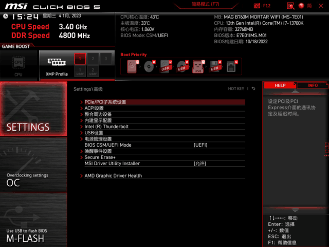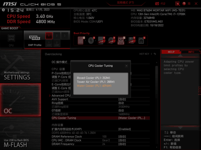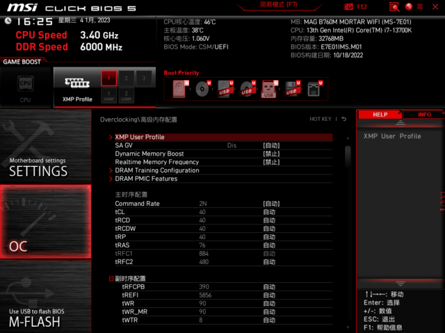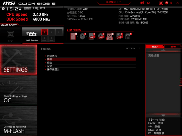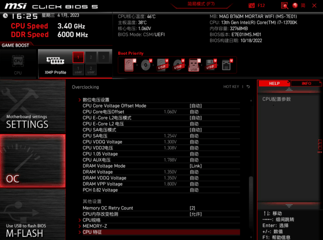 下面我们来看看WIFI主板的BIOS,微星 B760M MORTAR WIFI DDR5主板。微星 B760M迫击炮WIFI主板的非MAX版本没有超外频功能,相对来说比较容易调整,只需调整内存超频即可。