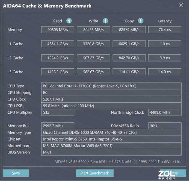 DDR5内存6000MHz频率的读写性能非常出色,在微星 B760M MORTAR WIFI DDR5主板上读取速度达到90505MB/s,写入速度达到80435MB/s,与DDR4相比,其性能确实要强得多。