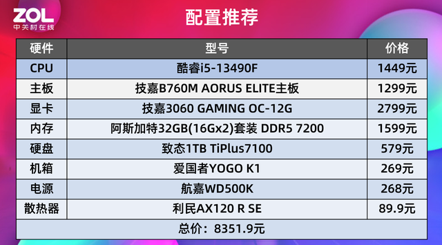 机电散选择就比较简单了,散热器是能压住i5-13490F的风冷。电源根据显卡和CPU规格考虑,酷睿i5-13490F和RTX3060都不是压力很大的和出纳品,500W足以,机箱则根据喜好,我么你选择的这款黑色整好契合技嘉 B760M AORUS ELITE,如果你要搭配白色B760MAORUS ELITE AX 小雕WIFI主板,也可以将机箱换成白颜色的款式。