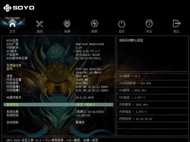 下面我们来看一下梅捷 H610M主板的BIOS,同属于商科旗下,梅捷与铭瑄一样都有了简单易用的中文化图形BIOS。