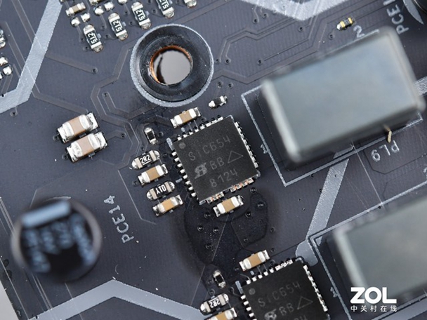 为了保证高阻抗时供电平衡,铭使用了三个超大合金散热器片覆盖在MOSFET,协助MOSFET迅速排热,顶部还有导热垫辅助散热。