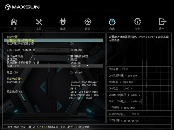 我们在BIOS中开启了XMP设置,内存频率为3600Mhz,萌新装机注意也要去BIOS里开启XMP,不然内存频率会默认在2133MHz,如果是3000Mhz低频内存就浪费了。