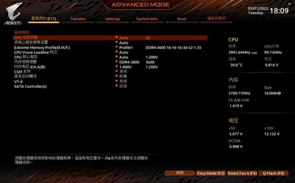 技嘉 B660M主板延续了技嘉这两年愈发完善的中文图形化BIOS设计,功能齐全,调校便捷。